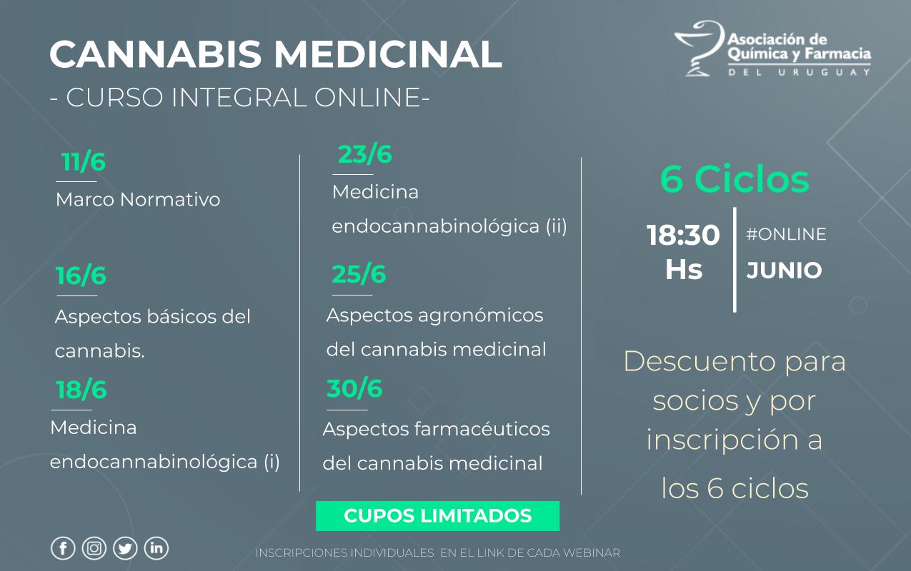 Curso virtual integral de Cannabis Medicinal. Curso virtual integral de Cannabis Medicinal. Inscripciones abiertas en: https://forms.gle/cVREAwd1XMQq8D4XA Puedes anotarte al ciclo que más te interese o al curso completo con un 15% off. Recordá enviar comprobante de pago a info@aqfu.org.uy
