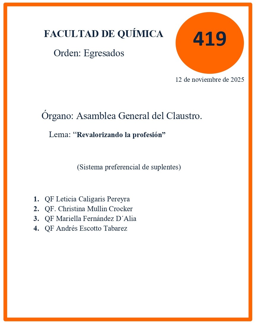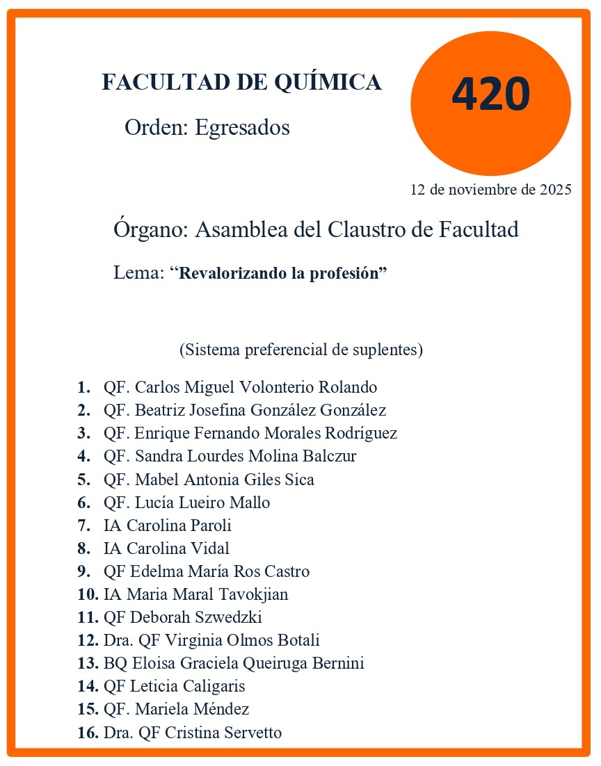 En esta instancia se elegirán representantes para integrar las listas correspondientes al Orden de Egresados de la Facultad de Química, bajo el lema “Revalorizando la Profesión”: