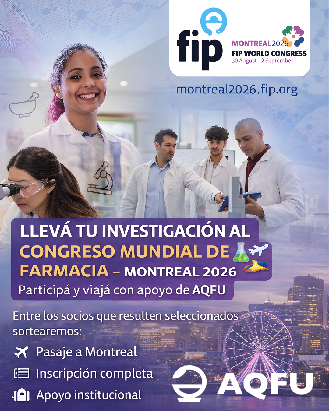 La International Pharmaceutical Federation (FIP) abrió la convocatoria de abstracts para el 84° Congreso Mundial de Farmacia y Ciencias Farmacéuticas, que se realizará en Montreal 2026 🇨🇦.